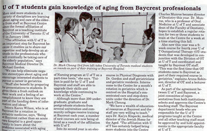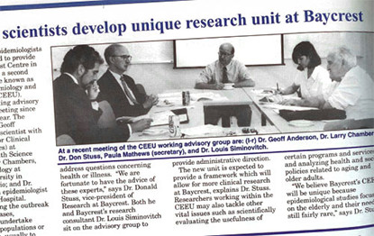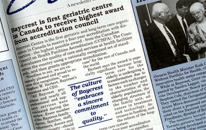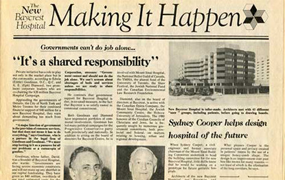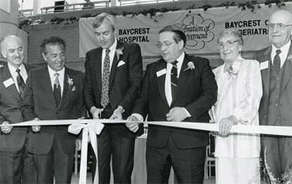 1913 “We can’t have our old folks sleeping in the park. Go knock door-to-door. Tell the people what’s the matter and ask for donations!” Slova Greenberg, President, Ezras Noshem (“helping women”) Society 1918 Thanks to Slova Greenberg, an active member of Ezras Noshem - a women's mutual benefit society, the Toronto Jewish Old Folks Home opens at 29 Cecil Street in Downtown Toronto. 1920s-1930s The adjacent houses are purchased and the home now cares for 75 residents. Part of the building is designated as a hospital with medical care donated by Jewish doctors. 1948 A 25-acre tract of land is purchased to build a new home for the aged and hospital on Bathurst Street. 1950 Construction begins on the 25-acre piece of land that would one day become Baycrest. 1953 The Atkinson Foundation provides a grant of $100,000 to design Canada’s first comprehensive geriatric medical program. 1954 Residents move to a combined Jewish Home for the Aged and Baycrest Hospital on Bathurst Street – a first in Ontario. The new Mount Sinai Hospital begins a four-week intern rotation at Baycrest – the first geriatric rotation of its kind in Canada, and probably in North America. Dr. Charles Markson is Baycrest’s first Physician-in-Chief (1954-1964). 1955 The Women's Auxiliary was formed with Dora Till – a volunteer since 1949 - as the founding president. 1956 Sam Ruth, a pioneer in health-care administration, becomes Baycrest’s chief executive officer, a position he holds until 1980. 1959 Baycrest Community Day Centre for Seniors is introduced – the first of its kind in Ontario. 1962 Construction begins at the New Jewish Home for the Aged, c.1962. 1963 Dr. Wulf Grobin embarks on a 30-year study showing diabetes and the need for anti-diabetic medication can be curtailed through diet, exercise and weight control. 1964 Dr. Henry Himel – Physician-in-Chief (1964-1977) 1967 The organization is officially incorporated as Baycrest Centre for Geriatric Care. 1968 The new Jewish Home for the Aged, Abe and Elsie Posluns Building opens and Baycrest Hospital occupies the old building. Late 1960s “Traditionally, the continuum of care has been viewed as a straight line, starting in the community, proceeding through the general hospital and ending in the nursing home. To be fully developed, it must be viewed as a dynamic circle.” – Sam Ruth, Baycrest CEO, and Stephen Rudin, Hospital Administrator 1970 An acute care unit opens – the first to be approved in a chronic care hospital. 1976 The Terraces of Baycrest, an assisted living residence for seniors, is built on the Baycrest campus. 1977 The Joseph E. and Minnie Wagman Centre, a recreational complex for seniors, opens next door to the Terraces. 1980 The Baycrest Foundation is opened with the goal of raising funds for programs and seniors' care. 1983 The first Behavioural Neurology Unit in Canada opens in Baycrest Hospital to serve patients with dementia. The Board of Directors identifies research and education in aging as part of Baycrest’s mandate. 1985 The Baycrest cafeteria opens and begins serving Kosher food to residents, staff, volunteers, and visitors. 1986 The new Baycrest Hospital, Ben and Hilda Katz Building, is the only geriatric hospital in Canada. 1987 A new day program is established at the Samuel Lunenfeld Mountainview Club, offering respite to families caring for seniors with cognitive disorders. 1988 Baycrest is a founding partner in Metro Toronto’s Regional Geriatric Program, an outreach service for older people living at home. 1989 The new Rotman Research Institute recruits top scientists to collaborate on research into brain and behaviour changes in aging. Baycrest is formally affiliated as an academic centre of the University of Toronto. 1990 The on-site Esther Exton Child Care Centre opens for staff and the community. 1991 “The Rotman Research Institute promises to be one of the premier institutions in the world for the study of brain-behaviour connections.” — Dr. Jeffrey Cummings, University of California 1992 Memory expert Dr. Endel Tulving joins the Rotman Research Institute to continue his groundbreaking work with a focus on aging and memory disorders. Rotman Research Institute scientist and 2005 Gairdner International Award winner 1993 “The culture of Baycrest is one that embraces a shared vision, teamwork, effective communication, and a sincere commitment to quality. Client programs are innovative and there is documented evidence of exemplary care.” — The report of the Canadian Council on Health Facilities Accreditation 1994 Rotman scientists use new Event-Related Potentials (ERP) technology to study neural activity in the brain. 1995 The Clinical Epidemiology and Evaluation Unit conducts long-term studies on health issues in aging and evaluates clinical programs. 1995 The first Barrie 2 Baycrest (B2B) bike ride event is held, organized by Stan and Susan Feldman, Larry Saltsman, and Michelle Levine. Over the past 21 years, the B2B ride has raised more than $13 million for exercise and wellness programs at Baycrest. 1996 The Ben and Hilda Katz Centre for Gerontological Social Work at Baycrest is the first university-affiliated social work research program located in a caregiving setting. 1997 The Rotman Research Institute is ranked among the top five brain research centres in the world by an internationally recognized panel of scientists. 1998 The joint Baycrest/University of Toronto Max and Gianna Glassman Chair in Neuropsychology is created. 1999 A study by Rotman scientist Dr. Randy McIntosh shows older adults perform just as well as young adults on visual, short-term memory tests, but that older adults use different parts of the brain. 2000 The new 472-bed Apotex Centre, Jewish Home for the Aged and opens its doors. 2001 Seniors move into Two Neptune Drive - the Reuben Cipin Healthy Living Community, a condominium-style rental building. Rotman scientists discover link between high-fat diets and p
