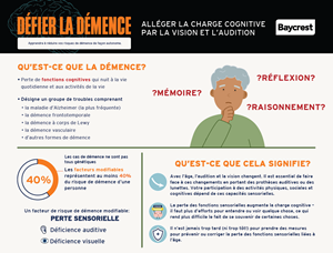 Défier la démence Épisode 1: Alléger la charge cognitive par la vision et l’audition Bienvenue au premier épisode de Défier la démence! Les animateurs Jay Ingram et Allison Sekuler, Ph. D., vous donneront de l’information de base sur la démence, en mettant l’accent sur le fait que la perte des fonctions sensorielles constitue un facteur de risque important de la démence. Écoutez les récits inspirants de Laurie Harris, qui a reçu un diagnostic de perte de l’audition à l’âge de 6 ans, et de Walter Wittich, Ph. D., un expert en perte de la vision et de l’audition qui s’occupe d’un proche atteint de démence. Dans ce premier épisode passionnant, nous vous proposerons de l’information et des mesures concrètes vous permettant de préserver la santé de votre cerveau, en particulier si vous présentez une perte d’audition ou de vision liée à l’âge. Defier la démence est une version traduite du balado anglais Defy Dementia. Toutes les voix entendues dans Défier la démence ont été générées par un logiciel à base d’intelligence artificielle. Épisode 1: Transcription Principaux points à retenir Les troubles de l’audition et de la vision font partie du processus normal du vieillissement, MAIS il est important d’agir pour remédier à ces problèmes en se procurant des lunettes ou des prothèses auditives. Votre participation à des activités physiques, sociales et cognitives dépend de vos capacités sensorielles : il vous sera donc plus facile de vous adonner à vos activités avec les outils appropriés. La perte des fonctions sensorielles augmente la charge cognitive – il faut plus d’efforts pour entendre ou voir quelque chose, ce qui rend plus difficile l’accomplissement d’autres tâches, comme se souvenir de ce que l’on vient d’entendre ou de voir. Il n’est jamais trop tard (ni trop tôt!) pour prendre des mesures pour prévenir ou corriger la perte des fonctions sensorielles liée à l’âge. Grandes lignes Jay : « La démence est en fait un terme générique, et non un trouble particulier. La maladie d’Alzheimer est une forme de démence – de loin la plus courante – mais il en existe d’autres, comme la démence frontotemporale, la démence à corps de Lewy et la démence vasculaire. Chaque trouble est caractérisé par une dégradation progressive des cellules nerveuses – les neurones – et des connexions neuronales. Au fil du temps, le cerveau perd progressivement des capacités comme celles lui permettant de penser, de se rappeler certaines choses et de raisonner. » Allison : « On prévoit qu’au moins 150 millions de personnes à travers le monde, dont un million rien qu’au Canada, seront atteintes de démence en 2050. Mais […] la démence n’est pas toujours un trouble génétique – en fait, les variants génétiques à l’origine de la démence ont été identifiés chez un nombre relativement petit de personnes – et ce n’est pas parce que votre grand‑mère ou votre grand‑père en est atteint que vous le serez aussi. » Laurie : « À tout le moins, allez chez l’audiologiste, passez un examen permettant de consigner vos résultats de référence dans un dossier. Ainsi, si vous avez l’impression, l’année prochaine, par exemple, que votre audition s’est un peu détériorée, vous pourrez retourner chez l’audiologiste et passer un autre examen, ce qui vous permettra de savoir si votre audition s’est réellement détériorée ou s’il y a d’autres problèmes. » Walter : « Je crois que, quelles que soient les difficultés qui se sont présentées ou qui se présenteront à chacun d’entre nous, il y a quelque chose que nous pouvons faire. Il y a une solution à portée de main. Il faut parfois faire preuve de résilience pour la trouver. Cela pourrait ne pas toujours être évident, mais nous sommes là depuis assez longtemps pour savoir beaucoup de choses sur les changements sensoriels et cognitifs. Nous devons simplement aller de l’avant et trouver ce dont nous avons besoin pour vivre la meilleure vie possible. » Pour accéder aux sous-titres français, cliquez sur Paramètres (Settings) > Sous-titres (Subtitles) > Français (French). Image infographique Cliquez pour agrandir Ressources Hearing Loss: A Common Problem for Older Adults – National Institute on Aging du National Institutes of Health’s (en anglais seulement) Association of Hearing Aids and Cochlear Implants With Cognitive Decline and Dementia: A Systematic Review and Meta‑analysis – JAMA Neurology (en anglais seulement) Hearing Aids and Cochlear Implants in the Prevention of Cognitive Decline and Dementia—Breaking Through the Silence – JAMA Neurology (en anglais seulement) Outils utiles pour mener une vie pleine et indépendante malgré une perte de vision Fondation INCA Improving vision may help prevent dementia – Harvard Health (en anglais seulement) Les aînés et le vieillissement – Soins de la vue – Santé Canada À propos de nos invités Laurie Harris, une Britanno‑Colombienne de 58 ans, travaille au sein d’une organisation qui propose aux aînés des services d’aide non médicale, tels que des services d’entretien ménager, qui leur permettent d’habiter plus longtemps leur domicile. Elle a reçu un diagnostic de perte d’audition à l’âge de 6 ans et elle a commencé à porter des prothèses auditives à l’âge de 24 ans. Il y a plusieurs années, elle a pris congé de son travail parce qu’elle se disait épuisée, en grande partie à cause de la charge cognitive nécessaire pour traiter le discours des autres lorsque l’on est une personne malentendante. Depuis, elle porte beaucoup plus attention à son cerveau. Elle médite et va à son rythme. Elle est également proche aidante, ce qui constitue une source de stress supplémentaire. Son mari a 22 ans de plus qu’elle et a besoin de plus en plus d’aide. Elle a repris le travail et mène une vie bien rempli