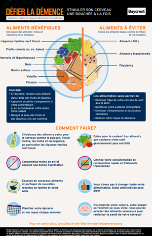 Épisode 5 : Stimuler son cerveau une bouchée à la fois Dans l’épisode 5 de Défier la démence, vous apprendrez que votre alimentation peut avoir une incidence sur la santé de votre cerveau. Tout d’abord, vous entendrez Anjali Gupta, une diététiste à la retraite qui a apporté plusieurs modifications à son régime alimentaire afin de réduire le risque de démence à la suite du diagnostic de démence de sa mère. Ensuite, renseignez-vous sur les effets des aliments sur le cerveau avec le Dr Thomas Holland, médecin et expert en nutrition du Rush Institute for Healthy Aging du Rush University Medical Center. Soyez à l’écoute pour obtenir des conseils pratiques qui vous aideront à choisir des aliments sains pour le cerveau. Defier la démence est une version traduite du balado anglais Defy Dementia. Toutes les voix entendues dans Défier la démence ont été générées par un logiciel à base d’intelligence artificielle. Épisode 5: Transcription Principaux points à retenir Manger des aliments sains peut réduire l’âge du cerveau de sept ans et demi, renforcer le système immunitaire, réduire l’inflammation et les lésions cellulaires, et réduire le risque de démence. Peu importe votre culture, votre budget ou l’endroit où vous vivez, vous pouvez acheter des aliments savoureux et sains pour le cerveau. Évitez les assiettes remplies d’aliments frits et de féculents de couleur beige. À l’épicerie, dirigez-vous d’abord dans l’allée des fruits et légumes. Les légumes-feuilles vert foncé, les fruits colorés, les grains entiers, les noix, les haricots et les légumineuses contiennent des vitamines et des minéraux de qualité qui améliorent les fonctions cérébrales. Principaux points saillants Jay : « De plus en plus de preuves montrent que la réduction des risques de démence passe par l’alimentation. » Anjali : « En raison du diagnostic de démence de ma mère, j’ai fait un effort très conscient pour ajouter une tonne de légumes-feuilles verts dans mon alimentation quotidienne. » Tom : « Certaines recherches montrent qu[’avec une alimentation saine], vous pouvez réduire l’âge de votre cerveau de sept ans et demi. Ainsi, une personne de 67 ans et demi qui maintient un apport nutritionnel élevé dans le cadre de ce régime pourrait avoir le cerveau d’une personne de 60 ans. » Allison : « En changeant un peu son comportement, on peut tout changer. […] peu importe vos habitudes alimentaires, vous pouvez les modifier légèrement et faire en sorte que ces conseils vous conviennent. » Vidéo d’une minute Pour accéder aux sous-titres français, cliquez sur Paramètres (Settings) > Sous-titres (Subtitles) > Français (French). Image infographique Ressources Le guide alimentaire pour un cerveau en santé – de Baycrest et du Consortium canadien en neurodégénérescence associée au vieillissement (CCNV) Recettes favorisant la santé cérébrale – de Cogniciti Feed Your Brain What It Needs – Eat Right [Donnez à votre cerveau ce dont il a besoin – Mangez bien] – de Cogniciti (en anglais seulement) 101 Tips for Tip-Top Health [101 conseils pour une santé optimale] – de la Harvard Medical School (en anglais seulement) Promoting Brain Health [Promouvoir la santé du cerveau] – module de formation gratuit d’iGeriCare En savoir plus sur nos invités Anjali Gupta est une diététiste à la retraite et une passionnée de cuisine végétarienne. Elle a immigré de l’Inde au Canada il y a 27 ans. Mme Gupta est titulaire d’une maîtrise en nutrition en Inde et d’un diplôme de l’Université de Toronto. Après ses études, elle a trouvé un emploi dans le système de santé publique. Depuis sa retraite anticipée, elle pratique le yoga et la pleine conscience pour réduire le stress. À sa grande surprise, sa mère a reçu un diagnostic de démence il y a deux ans. Ce diagnostic suscite chez elle une prise de conscience. Elle se documente sur les facteurs de risque de la démence et fait du bénévolat auprès d’associations de lutte contre la démence et à Baycrest pour en savoir plus. Depuis, son mode de vie a beaucoup changé afin de minimiser les risques et elle a modifié le régime alimentaire familial pour qu’il soit plus sain pour le cerveau. Le Dr Thomas Holland est à la fois médecin, expert en nutrition et neuroépidémiologiste. Son travail porte sur l’effet des modifications du mode de vie sur la santé du cerveau au cours du vieillissement. Il se nourrit de sa passion pour la nutrition et de son expérience d’une maladie neurodégénérative dans sa famille. Sa grand-mère a souffert de démence pendant près de dix ans. Il a également vu son beau-père lutter contre l’obésité et jongler avec différents régimes alimentaires. Ces deux expériences inspirent et alimentent sa pratique et sa recherche. Le Dr Holland est clinicien‑chercheur au Rush Institute for Healthy Aging du Rush University Medical Center, l’un des principaux centres américains d’étude des facteurs de risque nutritionnels liés à la maladie d’Alzheimer et à d’autres démences. Il est également membre du corps enseignant du College of Health Sciences, Department of Nutrition à la Rush University.