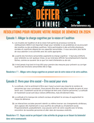 Épisode 6 : Résolutions pour réduire votre risque de démence pour le nouvel an Dans cet épisode spécial de Défier la démence, les co-animateurs Jay Ingram et Allison Sekuler, Ph.D. réfléchissent à ce qu'ils ont appris jusqu'à présent sur le balado et discutent des résolutions à prendre pour le nouvel an afin de réduire leur risque de démence. Ils explorent également des moyens de faciliter le respect des résolutions au-delà des premiers jours de janvier. Nous aimerions avoir de vos nouvelles : prenez-vous des résolutions pour votre santé cérébrale cette année ? Partagez-les avec nous par courriel à defydementia@baycrest.org ou sur les réseaux sociaux en utilisant le hashtag #defydementia. Defier la démence est une version traduite du balado anglais Defy Dementia. Toutes les voix entendues dans Défier la démence ont été générées par un logiciel à base d’intelligence artificielle. Épisode 6: Transcription Image infographique