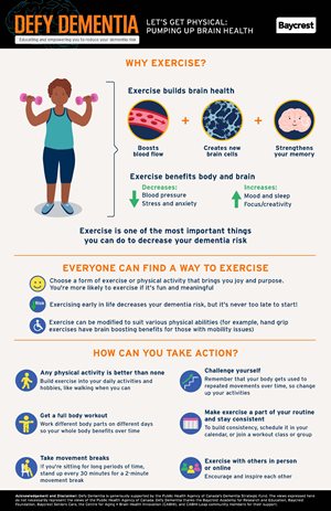 Episode 4: Let’s Get Physical – Pumping Up Brain Health Episode 4 of Defy Dementia focuses on exercise and its critical role in reducing dementia risk. We first speak to Ernestine Shepherd, an 87-year-old bodybuilder. Ernestine shares how exercise became her anchor during a challenging phase in life and why it remains a vital part of her daily routine today. Then, we turn to Dr. Jennifer Heisz, a brain health expert from McMaster University, an adjunct scientist at Baycrest’s Rotman Research Institute and a triathlete, to hear about the ways in which exercise can protect the brain against cognitive decline and dementia. Don’t miss this exciting new episode to learn how you can use exercise to boost your brain health. Episode 4: Transcript Key takeaways Exercising early or late in life can reduce your dementia risk. For those living with mild cognitive impairment, it can reverse negative brain changes, and for those living with dementia it can slow disease progression. It can be difficult to start exercising, but the good news is that any movement is better than no movement at all. For example, if you’re sitting for long periods of time, try to stand up for a 2-minute movement break twice an hour. Do something that brings you joy like walking, dancing, or sports, and do it regularly – schedule it in your calendar or work out with a partner. Key highlights Allison: “It's well established that exercise and physical activity are good for the body, but it might surprise you to know that they're also good for your brain, and I mean really good for your brain. Whether you're young or old, exercise can reduce your risk of dementia or delay its progression if there's already a diagnosis.” Ernestine: “Late in life, after my sister had died from a brain aneurysm, I had promised her that I would really start becoming a bodybuilder and helping as many people as I can to live a healthy, happy, positive, confident lifestyle by first prayer, eating healthy, getting out, walking, and lifting weights. And this and that is what I have been doing all of these years from the age of 71 on up.” Jennifer: “We compared physical inactivity to genetic risk for dementia, and we found that physical inactivity can actually completely negate a healthy set of genes. So you can't change your genes, but you can change your lifestyle. This is so important. I think it’s a very empowering message for people that just the simple act of moving the body can do a lot to protect your brain as you get older.” Jay: “I think [consistency and inspiration] are so closely linked because, in a way, to do exercise for its ultimate benefit, you really have to do it. You can't just decide, ‘Maybe this afternoon if it's sunny.’ And that's where the inspiration comes in. I think those two help alleviate the inertia that people might feel.” Infographic Click to enlarge Resources Arnold’s Pump Club Newsletter – from Arnold Schwarzenegger Baycrest’s Kimel Family Centre for Brain Health and Wellness Dr. Jennifer Heisz’ book, Move the Body, Heal the Mind Regular exercise changes the brain to improve memory, thinking skills – from Harvard Health Expert Alert: Keep exercising: New study finds it’s good for your brain’s gray matter – from the Mayo Clinic Working out boosts brain health – from the American Psychological Association How Exercise Protects Your Brain’s Health – from the Cleveland Clinic How to Exercise for Better Brain Health, According to Experts – from EatingWell How Exercise can Boost Brain Power - University of British Columbia Learn more about our guests Ernestine Shepherd is an American bodybuilder who is best known for being, at one point, the oldest competitive female bodybuilder in the world, as declared by the Guinness Book of World Records in 2010 and 2011. She just turned 87 years old and is still an active, albeit no longer competitive, bodybuilder who teaches classes at a local gym. At age 56, she and her sister Mildred Blackwell, then 59, went to try on swimsuits and found their bodies were out of shape. They promised each other they’d get in shape. They started taking aerobics classes. Her sister began competing in bodybuilding shows under the name Velvet, and Ernestine followed under the name Ernie. Her sister died in the early 1990s following a brain aneurysm. Shepherd entered a deep depression, but resolved to carry on her bodybuilding career, in part, to remember her sister. Four years ago, Ernestine’s husband of 65 years died, and she became depressed again. And again, exercise helped her recover. To this day, working out and keeping in top shape still serves as a way to remember her loved ones. Dr. Jennifer J. Heisz is an expert in brain health and a triathlete. She is Associate Professor in the Department of Kinesiology at McMaster University and Director of the NeuroFit Lab, which has attracted over $1 million to support her research program on the effects of exercise on brain health. Dr. Heisz received her Ph.D. in Cognitive Neuroscience (McMaster) and completed a postdoctoral fellowship in Brain Health and Aging at Baycrest’s Rotman Research Institute. Dr. Heisz's research examines the effects of physical activity on brain function to promote mental health and cognition in young adults, older adults, and individuals living with Alzheimer’s disease. Many honours and awards recognize Dr. Heisz for her outstanding contributions to research, including the Early Researcher Award from the Government of Ontario, the Petro-Canada Young Innovator Award, and the Canada Research Chair in Brain Health and Aging. She is the author of Move the Body, Heal the Mind, a book that’s designed to help people overcome anxiety, depression and dementia and improve focus, creativity, and sleep. As the New York Times says, the book documents “her own journey from inactivity and serial emotional slumps to triathlon training and increasing serenity.”