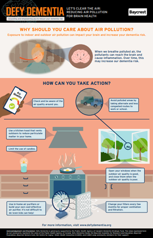Defy Dementia Episode 7: Let’s Clear the Air – Reducing Air Pollution for Brain Health This episode of Defy Dementia focuses on outdoor and indoor air pollution and its impact on brain health. First, we speak to Dr. Mark Weisskopf (Harvard University) about outdoor pollution, such as wildfire smoke, and how it may increase your dementia risk. Then, we meet Shiven Taneja, a Mississauga teen who builds do-it-yourself (DIY) air purifiers at a low cost for vulnerable community members. Finally, Dr. Tara Kahan (University of Saskatchewan) discusses ways to reduce your exposure to indoor sources of pollution, such as cooking and candle fumes. Tune in today for practical tips on lowering your indoor and outdoor pollution exposure, and decrease your dementia risk! Episode 7: Transcript Key takeaways Exposure to indoor and outdoor air pollution can impact your brain and increase your dementia risk. To reduce your exposure to outdoor air pollution, wear a mask, avoid highly polluted areas, and stay indoors when the air quality is poor. To reduce your exposure to indoor air pollution, properly ventilate your stovetop and oven, use air purifiers (you can even build your own!), and open your windows when the air quality is good outside. Key highlights Jay: “The idea that air pollution may be a risk factor for poor brain health is relatively new. That idea gained new prominence in 2020 when scientists writing in the prestigious U.K. medical journal The Lancet added air pollution to their list of risk factors for dementia.” Dr. Weisskopf: “Just the fact that there are effects of these air pollutants on the brain is something people should be aware of in order to try and not only on a personal level do what you can to avoid excess exposure, but also to help work at a higher-level policy government level to try and limit the levels of these things in the air.” Shiven: “In the end, [a DIY air purifier] sometimes ends up becoming even more effective than a HEPA filter.” Dr. Kahan: “There's a big disconnect between what we think of as clean and fresh [air] and what's actually good for us. You're probably better off without [scent diffusers, candles, etc.]. There are so many ways that we can reduce this exposure.” Dr. Sekuler: “I think it's important to recognize that there are some easy things that you can do to take action to protect the air quality around you yourself, whether it's wearing masks or building these Corsi-Rosenthal boxes, checking the air quality outside... But it's also critical for people to understand that the risk is relatively low and it's really a societal problem.” Infographic Click to enlarge Resources Studies on air pollution and dementia risk: Western research shows traffic related air pollution linked to increased risk of dementia – from Western University Air pollution linked to higher dementia risk: Study – from WebMD Air pollution may increase risk for dementia – from Harvard T.H. Chan School of Public Health Check the air quality in your area: Local Air Quality Health Index – from the Government of Canada Air Now – Air Quality Index for the US – from the US Government Air Pollution in World: Real-time Air Quality Index Visual Map Tips to reduce your air pollution exposure: Tips for reducing indoor pollutants in your home – from HealthLinkBC Improve indoor air quality in your home – from the Government of Canada 10 tips to protect yourself from unhealthy air – from the American Lung Association How to build your own air purifier: Science in action: How to build a Corsi-Rosenthal box – from UC Davis College of Engineering Instructions: How to make a Corsi-Rosenthal Box Instructions: How to make a Mini Corsi-Rosenthal Box Learn more about our guests Dr. Marc G. Weisskopf, Ph.D., Sc.D., is the Cecil K. and Philip Drinker Professor of Environmental Epidemiology and Physiology at the Harvard T.H. Chan School of Public Health in the departments of Environmental Health and Epidemiology and Director of the Harvard TH Chan NIEHS Center for Environmental Health. Dr. Weisskopf received his Ph.D. in Neuroscience from the University of California, San Francisco, and his Sc.D. in Epidemiology from the Harvard T.H. Chan School of Public Health. His work focuses on the influence of environmental exposures on brain health across the life course and epidemiological methods to improve causal inference from observational environmental health studies. Shiven Taneja is a grade 11 student at Mentor College in Mississauga. He is an avid athlete who plays competitive squash and is part of his school’s badminton and cross-country teams. Shiven is also an aspiring engineer. He loves tinkering with 3D printing techniques and is a passionate member of an Oakville-based FIRST Robotics team. In addition, Shiven is an engaged community member who has served on the RCMP National Youth Advisory Committee. He currently volunteers as a Frontline member of Credit Valley Conservation Youth Corps. In his spare time, he builds DIY air filter devices at cost for vulnerable community members. Dr. Tara Kahan is a Professor and Canada Research Chair in Environmental Analytical Chemistry at the University of Saskatchewan. She obtained a B.Sc. degree from the University of Regina and a Ph.D. from the University of Toronto (working with Dr. Jamie Donaldson). Dr. Kahan completed postdoctoral fellowships with Dr. John Hemminger (University of California Irvine) and Dr. Veronica Vaida (University of Colorado Boulder). Her major research areas are atmospheric chemistry in water and ice, and indoor chemistry.